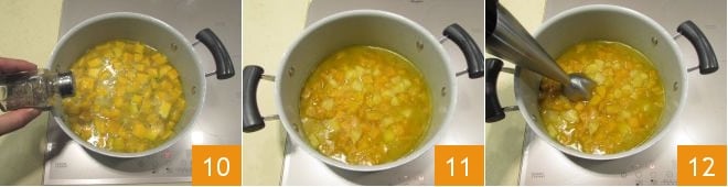 Adjust with salt and pepper 10 and cook over low heat for 25-30 minutes 11, occasionally adding more vegetable broth. Once the vegetables are cooked, turn off the heat and start blending everything with an immersion blender 12