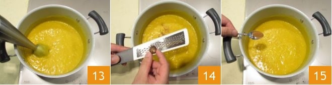 until you get a smooth and homogeneous cream 13. Add a sprinkle of nutmeg and cinnamon and mix everything 15; at this point your pumpkin cream is ready, so set it aside.