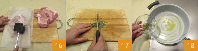 Take the chops and pound them with a meat tenderizer until they are about 1/2 inch thick 16, then mince the sage and rosemary and place them in a non-stick pan with a drizzle of oil 18.