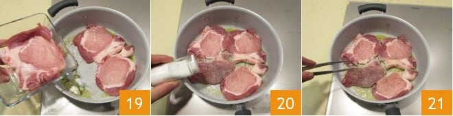 Lay the chops in the pan 19, adjust with salt and pepper 20 and let them brown for 5 minutes on each side over medium-high heat 21. It will take a total of 10 minutes if they are not too thick.