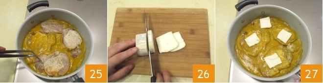 Let the meat soak in the pumpkin cream 25 for another 5 minutes, then cut the taleggio into slices 26 and place one on each chop 27. Cook for another 2 minutes so the taleggio melts.