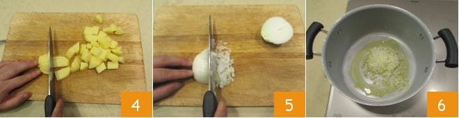 and also cut them into cubes 4. Then take the onion, clean it and finely chop it 5, transfer it to a pan with the oil and sauté over low heat 6.