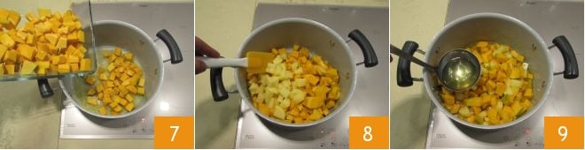 Once the onion is golden, add the pumpkin to the pan 7 along with the potatoes 8. Gradually add some ladles of vegetable broth 9 until the vegetables are covered.