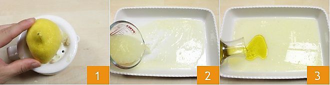 To make pork souvlaki, start by preparing the marinade that will flavor the meat: squeeze the lemon juice 1, in a rectangular dish about 9x14 inches, place the lemon juice 2, the oil 3,