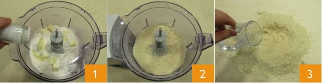 To make the pork tenderloin en croute, first prepare the Easy Shortcrust Pastry: place the flour, cold butter cut into pieces, and a pinch of salt in the mixer 1 and blend until you get a mixture with a crumbly texture 2. Transfer the mixture to a work surface and form a well, kneading quickly while gradually adding cold water 3.