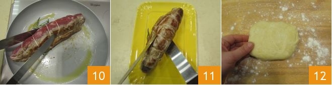 Brown it well on all sides to better seal the meat, being careful not to pierce the surface which would cause juices to escape 10. Once the pork tenderloin is well browned, place it on a plate 11 and let it cool. Now take out your shortcrust pastry, lightly flour it 12