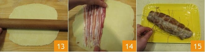 and roll it out on a work surface to about 1/8 inch thick 13. Lay the slices of bacon on the pastry, slightly overlapping them 14. Cut the twine wrapping the tenderloin 15,