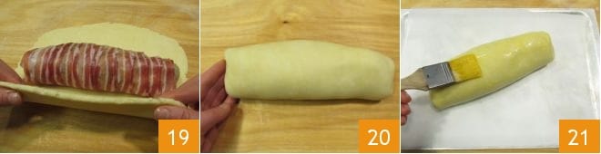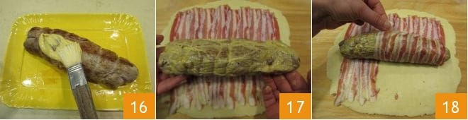 brush mustard on the surface to flavor it 16, and place it in the center of the pastry 17. Lift the slices of bacon to fully cover the tenderloin 18.