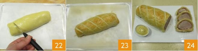 and score it with a knife to create decorative diagonal cuts 22. Bake the pork tenderloin en croute at 355°F for 30 minutes, then continue cooking under the broiler for 5 minutes or until the crust begins to brown. Once cooked, remove the meat from the oven 23 and serve it sliced, accompanied by mustard 24.