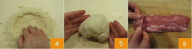 Knead quickly 4 being careful not to overheat the dough, working it until it becomes compact and firm 5. Once ready, wrap the shortcrust pastry in a sheet of plastic wrap and let it rest in the fridge for at least 30 minutes. Now take the pork tenderloin, trim off any fatty parts, and fold the thinner ends 6.