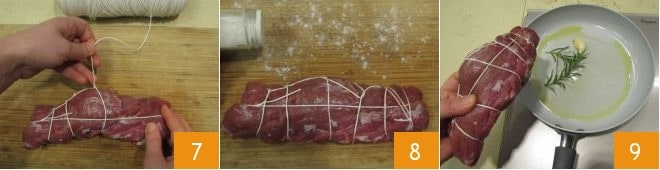 Truss the tenderloin with kitchen twine 7; for more details on this process, you can refer to our guide How to tie a roast. Salt 8 and pepper the tenderloin, then heat the olive oil in a pan with the peeled clove of garlic and rosemary, and place the tenderloin in the hot pan 9.