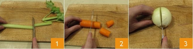 To make the orange pork tenderloin, prepare the Vegetable broth. Then move on to the vegetables that will be used to flavor the roast: wash and peel the celery and carrot, peel the onion, and then proceed to cut the vegetables into coarse pieces (1-2-3).