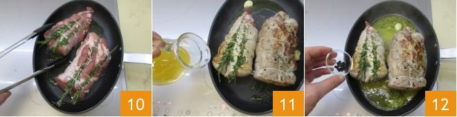 place the meat in the pan 10 and sear it on all sides over high heat to create a crust on the surface. Deglaze with the orange juice 11, then add the peppercorns 12