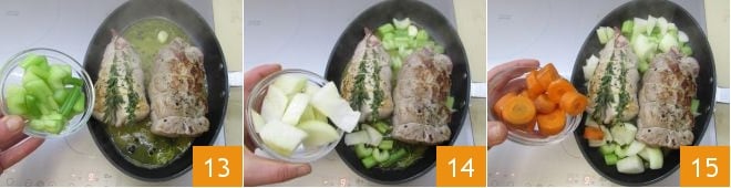 proceed by adding all the vegetables: the celery 13, the onions 14, and the carrots 15.