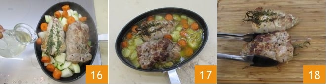 Lastly, add the vegetable broth 16. At this point, turn off the heat and continue cooking in a preheated static oven at 392°F (200°C) for 1 hour. Once cooked 17, remove the tenderloin from the pot (keeping the cooking juices aside) 18