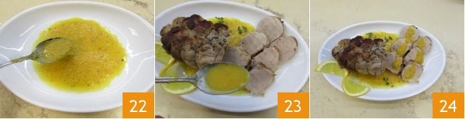Distribute part of the sauce on a serving dish 22, place the sliced roast (if you prefer, you can leave part of it whole) and season it with more sauce 23. You can garnish the orange pork tenderloin with thin slices of orange and serve it hot 24.