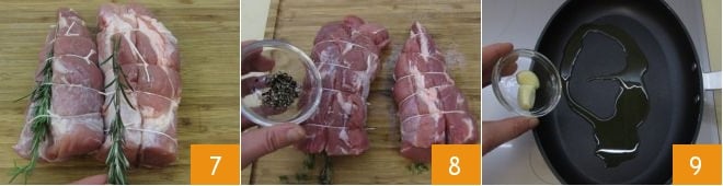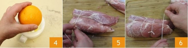 Squeeze the juice of an orange 4 and set it aside. Now focus on the meat: first, place the pork tenderloin on a cutting board and remove excess fat and tendons (the translucent white part). Then create the netting with kitchen twine (5-6), to perform this operation best, follow our cooking school guide:How to tie a roast.