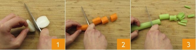To prepare the Port braised beef with apples and rosemary, first wash and peel the vegetables, then chop them roughly (1-2-3).