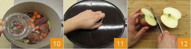Add water 10, season with salt and pepper, cover with a lid 11, and cook over low heat for at least two hours. Meanwhile, work on the apples: wash and halve them 12;