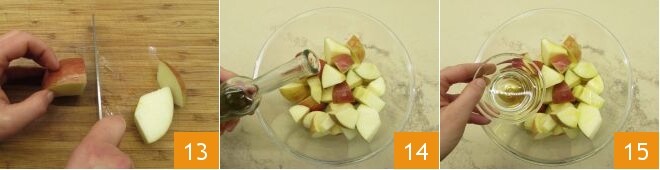 remove the core and chop into rough wedges 13. Transfer everything to a bowl, season with oil 14, and apple cider vinegar 15