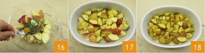and rosemary. Season with salt, pepper, and turmeric 16, and mix to flavor them. Grease a baking dish with oil, add the seasoned apples 17, and bake in a preheated static oven at 350°F (180°C) for about 20 minutes. Once ready 18, keep the apples warm.