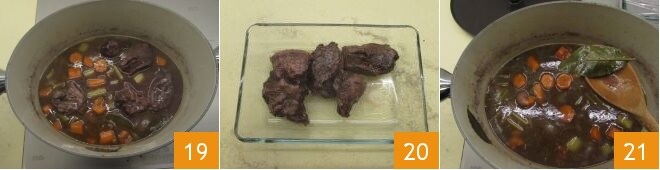 Meanwhile, the braised beef will also be done cooking 19, remove the meat and set it aside 20. Remove the bay leaves 21