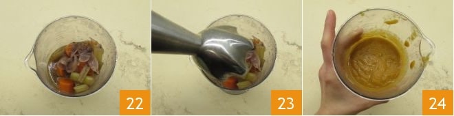 and extract only the vegetables, place them in a tall mixer glass 22 and blend with an immersion blender 23 to obtain a puree 24.