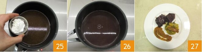 In a small saucepan, pour the remaining cooking broth, add cornstarch 25, and reduce the sauce over low heat 26. Serve the braised beef with apples, vegetable puree, and drizzle the meat with the sauce made from the cooking broth 27.