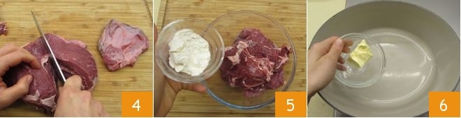 Now cut the meat into pieces of about 7 oz (200 g) 4 and coat them in flour 5. In a large pot, add the butter and melt it over medium heat 6.