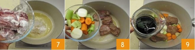 Once the butter has melted, add the floured meat 7 and brown it on all sides for a few minutes. When the meat is well browned, add the vegetables 8, bay leaves, juniper berries, and Port wine 9.