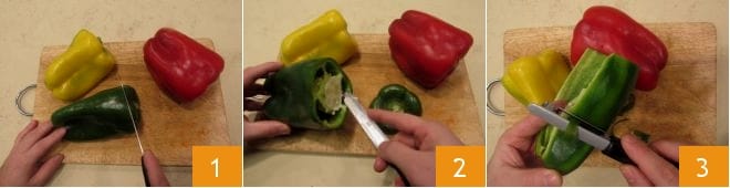 To prepare the potato and bell pepper frittata, start by placing a pot with plenty of water on the stove, which you will use for the Vegetable broth. Continue by cleaning the bell peppers: wash them well under plenty of fresh running water and dry them with paper towels. Remove the top part 1, then use a knife to remove the white filaments and seeds inside 2; peel them using a vegetable peeler 3,