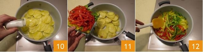 Add the sliced potatoes, seasoning with salt 10 and pepper, and cook over medium heat for 3-4 minutes. Next, add the bell pepper strips 11 and cook for another 7-8 minutes, stirring with a spatula 12.