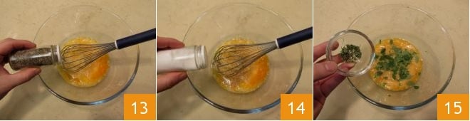 In a separate bowl, beat the eggs, seasoning with salt and pepper (13-14), marjoram, and thyme 15;