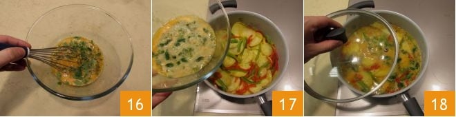 mix everything with the whisk to combine the ingredients well 16. When the vegetables are ready, add the beaten eggs 17 and continue cooking for 10 minutes over low heat, covering with a lid 18.