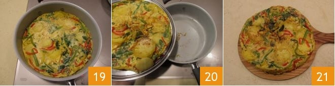 After the necessary time 19, flip the frittata with the help of the lid 20 and cook it on the other side for 2-3 minutes. Once ready, you can serve and enjoy your potato and bell pepper frittata 21.