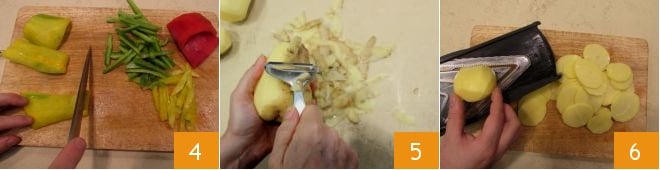 then cut them into strips about 1/4 inch thick 4. Peel the potatoes 5 and use a mandoline to cut slices about 1/8 inch thick 6.