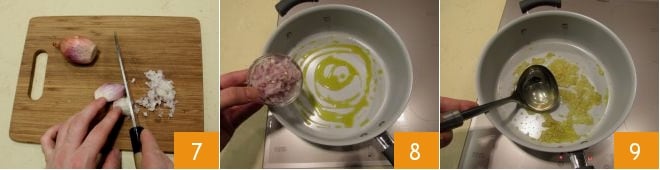 Finely chop the shallot 7, sauté it in a large non-stick pan with the oil 8, then add the hot vegetable broth 9.