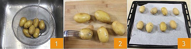 To prepare the potato boats with cheddar and bacon, wash the potatoes well under running water 1, dry them and then pierce the skin with the tines of a fork 2 or a toothpick. Place the potatoes on a baking sheet lined with parchment paper 3 and bake in a preheated oven at 392°F for about an hour.