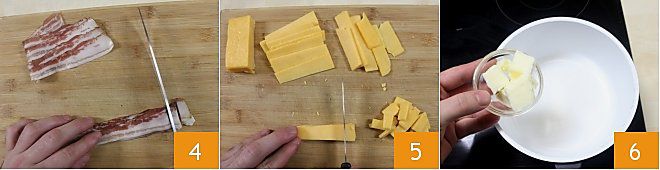 While the potatoes are cooking, cut the bacon and cheddar into small pieces (4-5) and melt the butter in a small saucepan 6.
