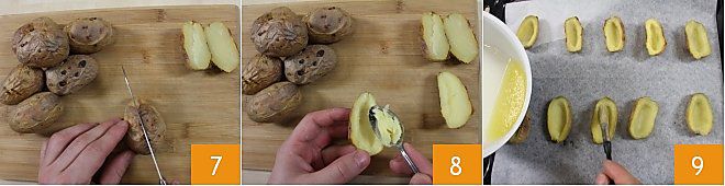 When the potatoes are cooked and tender, remove them from the oven and cut them in half, being careful not to break the skin 7. With a teaspoon, scoop out the flesh from the center of the potatoes 8, leaving about a 1/4 inch border. Place the potato boats on the baking sheet and brush the inside with melted butter 9; return them to the oven for 15 minutes until they are well-browned.