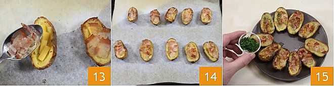the crispy bacon 13 and bake them again until the cheese is melted 14. Serve the potato boats with cheddar and bacon right after taking them out of the oven, sprinkling them with chopped parsley 15 or chopped chives as desired!