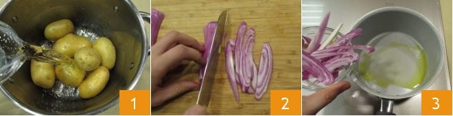 To make the potato burgers, first place the potatoes in a saucepan, cover them with water 1, and boil them for about 40 minutes or until they are soft. Clean and slice the onions 2, heat the olive oil in a pan, and add the onions 3,