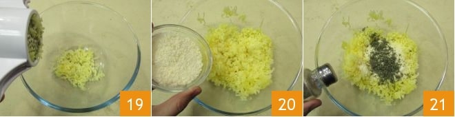 Once the potatoes are ready, put them hot and unpeeled in a potato masher, collecting the puree in a large bowl 19. Add the grated cheese 20, the chopped herbs, salt, and pepper 21.