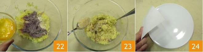 Add the stewed onions, the beaten egg 22, then add breadcrumbs one tablespoon at a time until you get a firm mixture 23; the dough may require more or less depending on its consistency. Everything is ready to form the burgers: cut a square of parchment paper about 5 inches on each side and place it on a small plate 24.