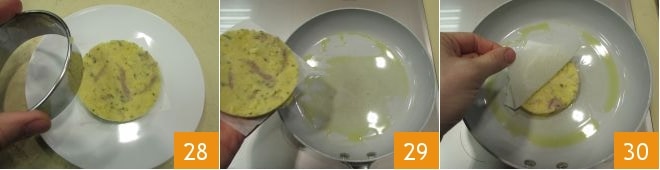 Carefully remove the cutter: this is how you get your burger 28. Now move on to cooking: heat a pan with a drizzle of olive oil, place the burger by lifting it with the paper so that it stays firm 29. Once placed on the pan, remove the parchment paper 30.