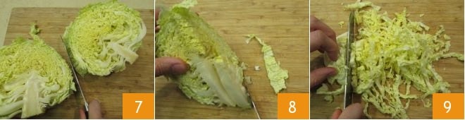 In the meantime, prepare the salad: cut the cabbage in half 7, remove the tough central stem 8, then slice it into thin strips 9.