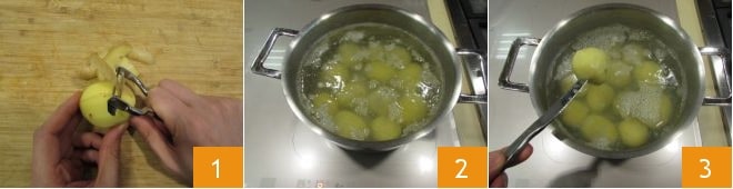 To prepare the potato, cheese, and bacon bites, first peel the new potatoes 1. Then place them in a pot full of lightly salted water and boil them for about 20 minutes 2. You can check for doneness by inserting a knife 3 or a toothpick; if the potato slides off easily, it means it is cooked.