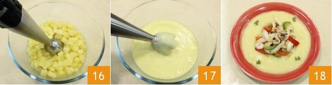 Focus on the cream: transfer the cooked potatoes to a high-sided bowl and blend them with an immersion blender 16 until you get a thick cream 17, add salt and pepper, and distribute the cream onto serving plates, placing the sautéed cuttlefish in the center. Drizzle with a little raw olive oil and immediately serve your potato cream with cuttlefish 18.