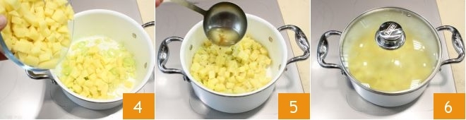 when it is softened, add the potatoes 4, cover them with the vegetable broth 5, and continue cooking, add salt, cover with a lid 6, and cook over medium heat for about 15 minutes.