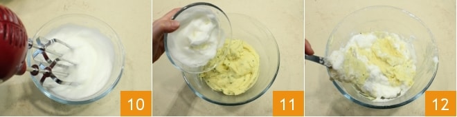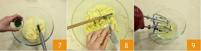 until they are white, firm, and frothy 10. Gently fold them into the potato mixture 11 and mix with a spatula from top to bottom to avoid deflating them 12.